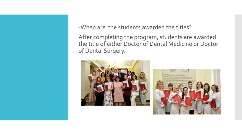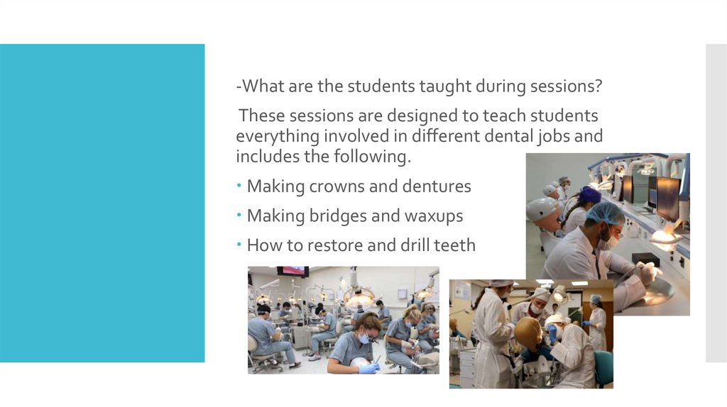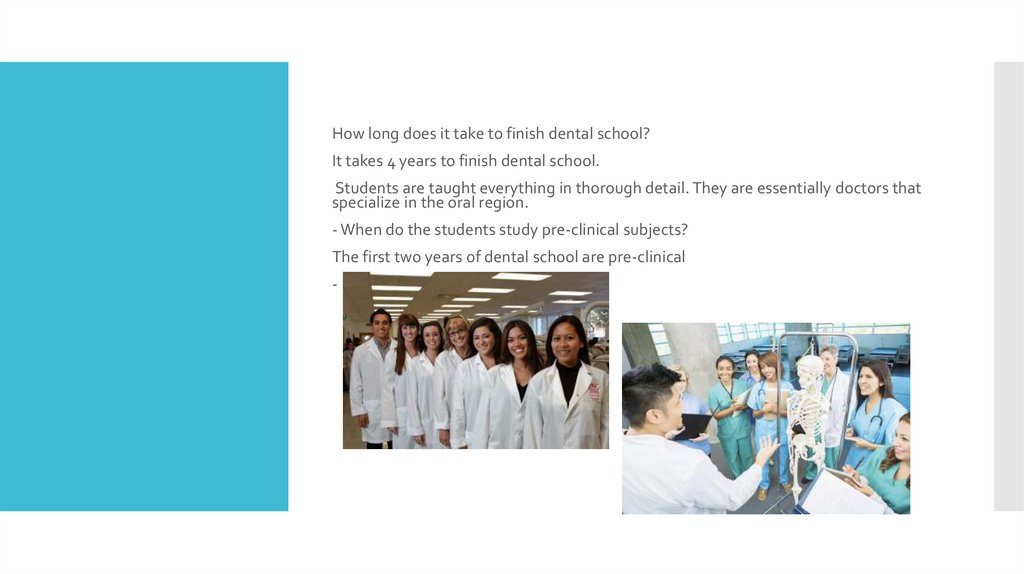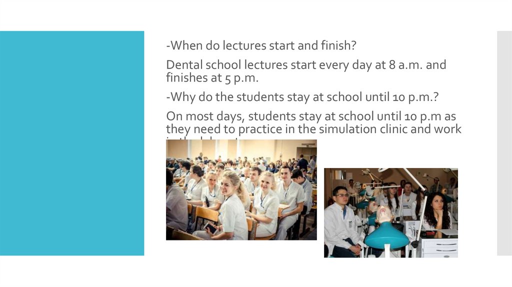 -When do lectures start and finish?Dental school lectures start every day at 8 a.m. and