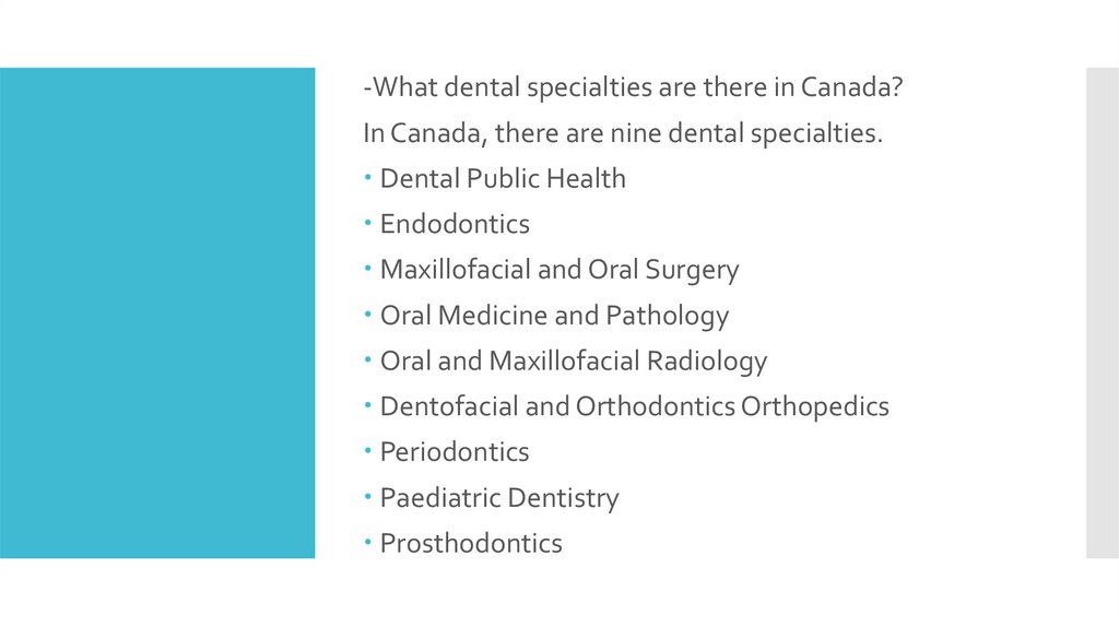 -What dental specialties are there in Canada?In Canada, there are nine dental specialties.