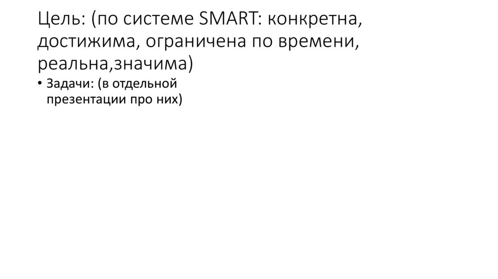 Цель: (по системе SMART: конкретна,достижима, ограничена по времени,