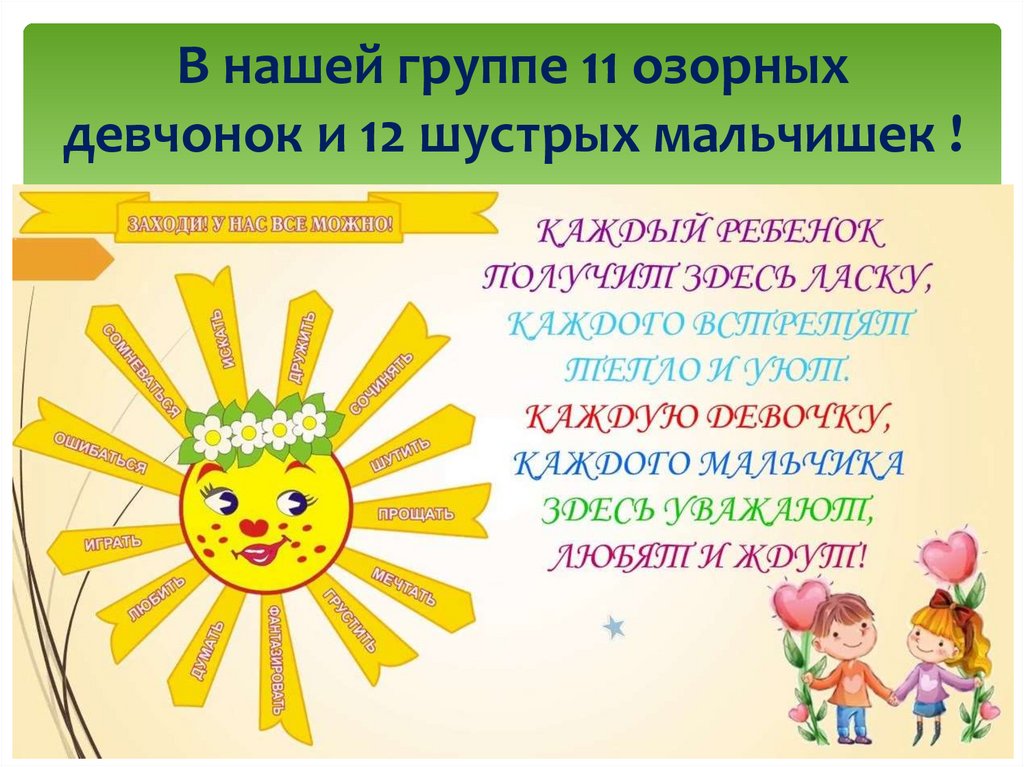 В нашей группе 11 озорныхдевчонок и 12 шустрых мальчишек !