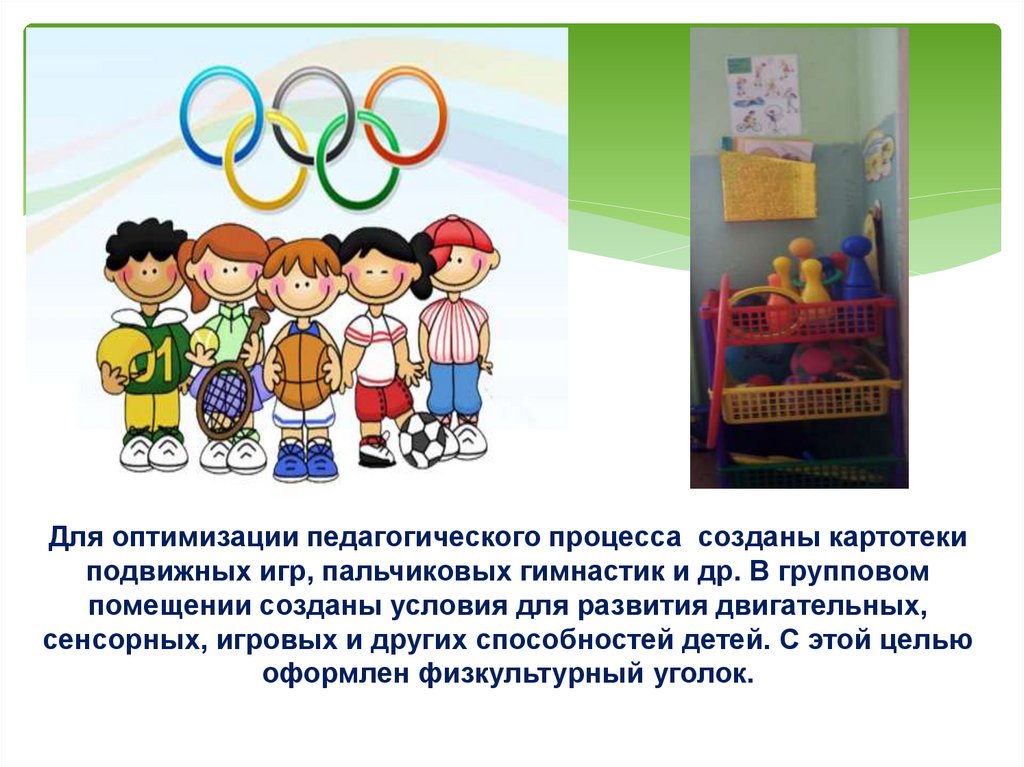 Для оптимизации педагогического процесса созданы картотекиподвижных игр, пальчиковых гимнастик и др. В групповом