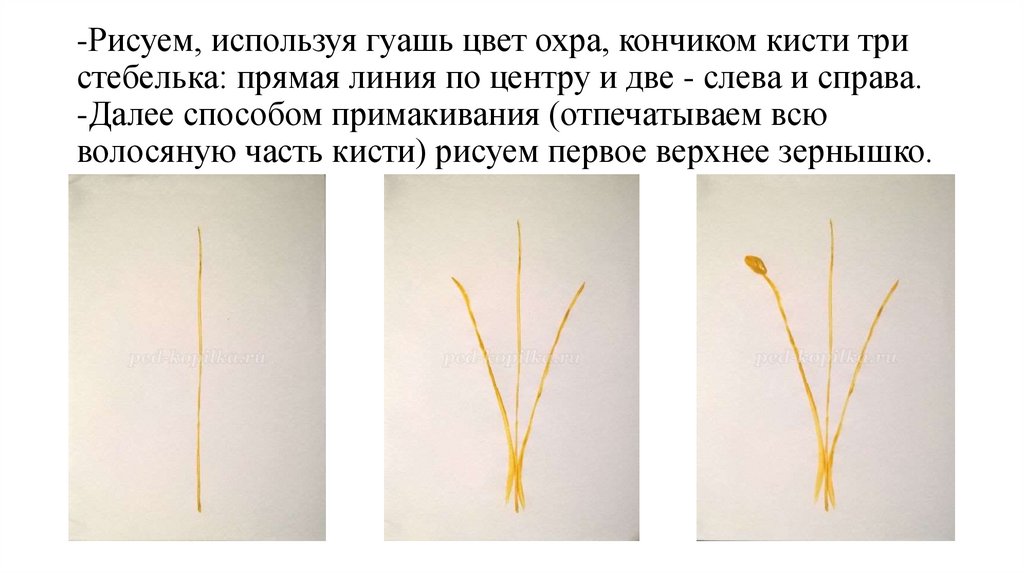 -Рисуем, используя гуашь цвет охра, кончиком кисти тристебелька: прямая линия по центру и две - слева и справа.