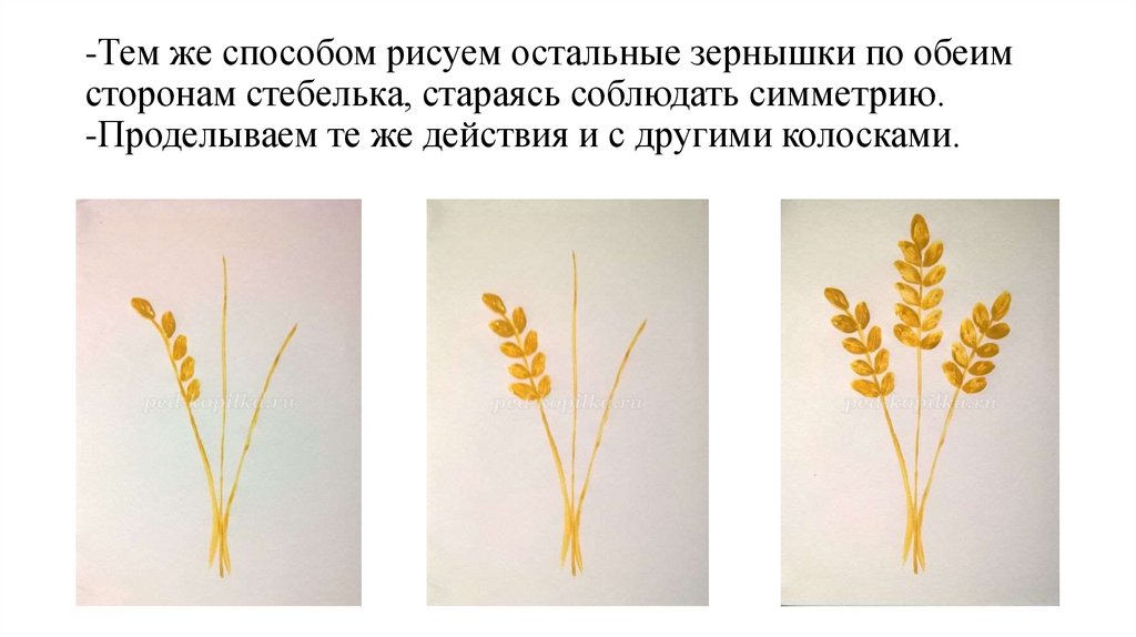 -Тем же способом рисуем остальные зернышки по обеимсторонам стебелька, стараясь соблюдать симметрию.