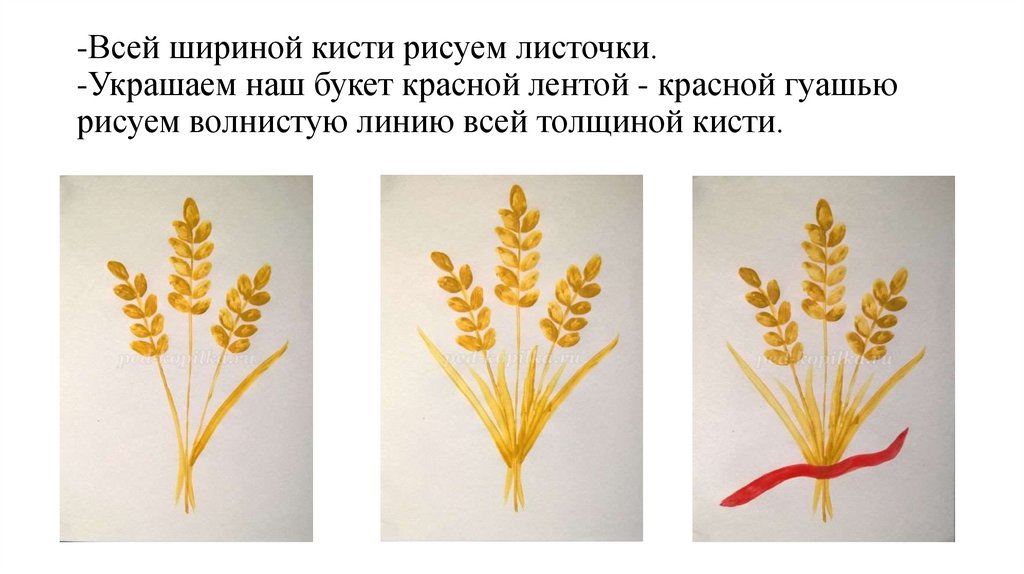 -Всей шириной кисти рисуем листочки.-Украшаем наш букет красной лентой - красной гуашью