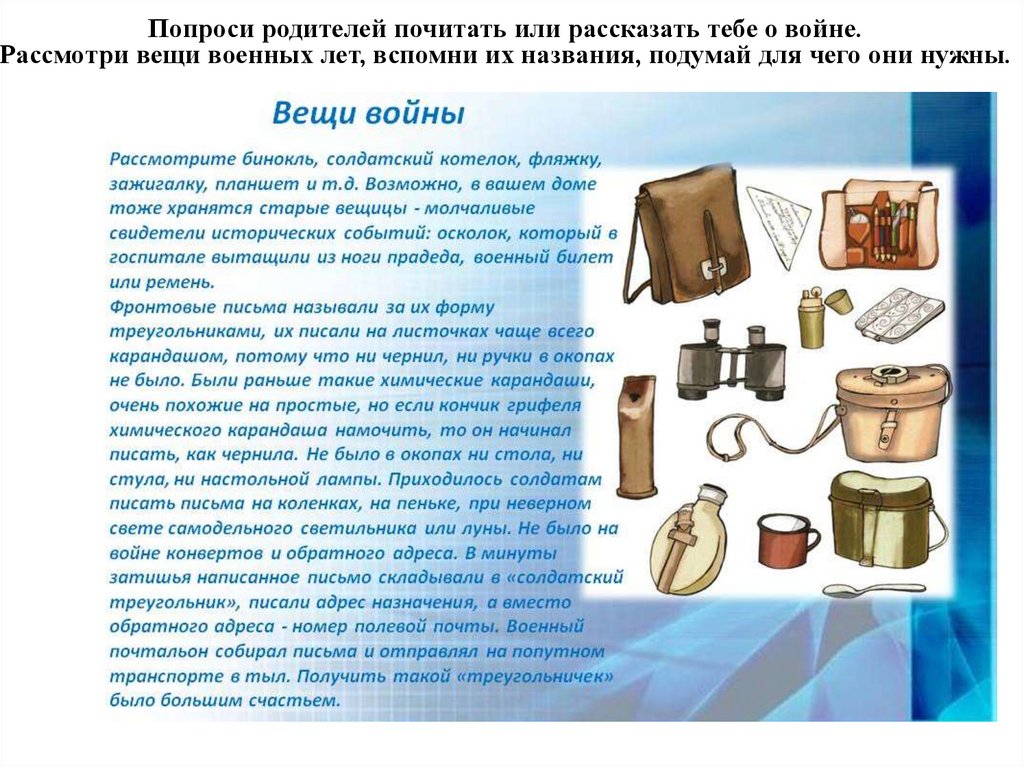 Попроси родителей почитать или рассказать тебе о войне.Рассмотри вещи военных лет, вспомни их названия, подумай для чего они нужны.
