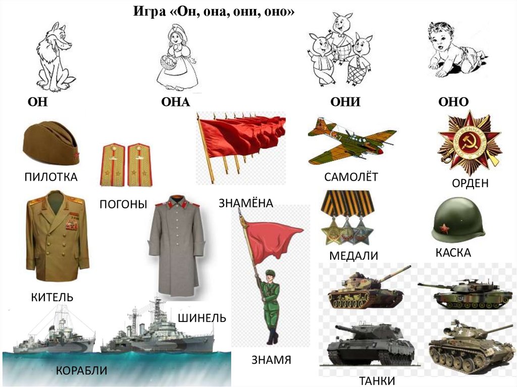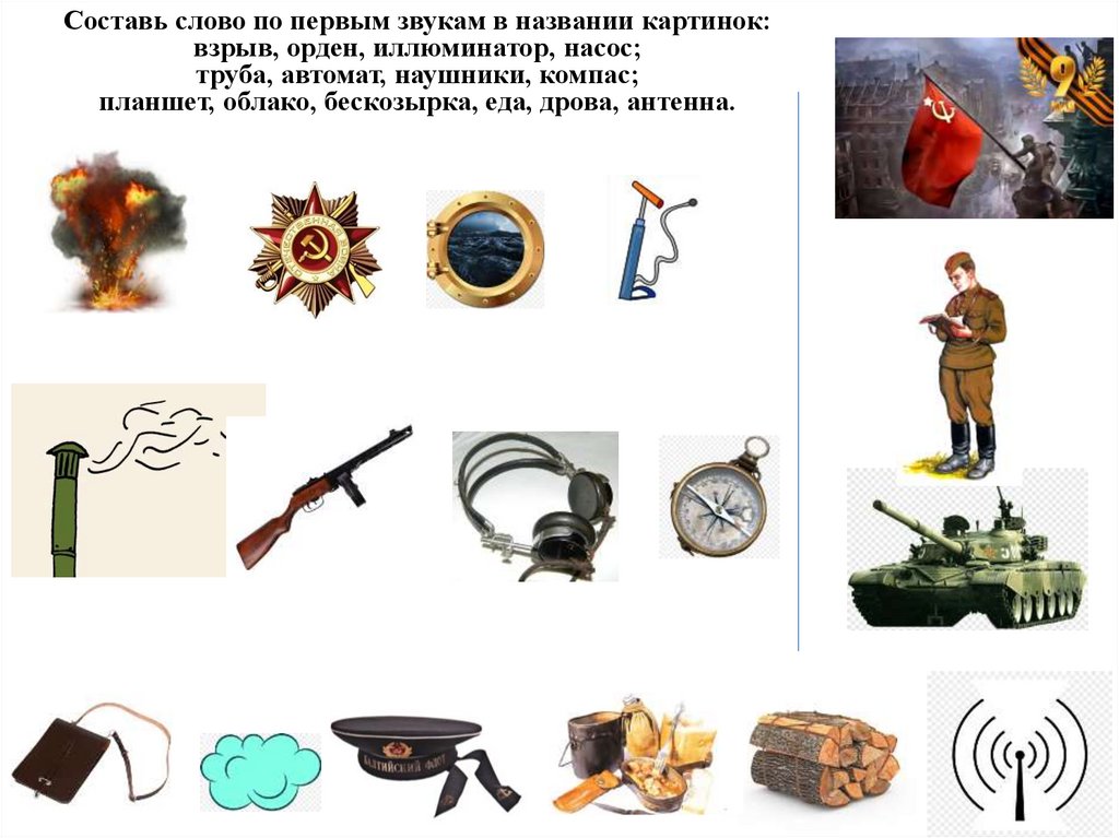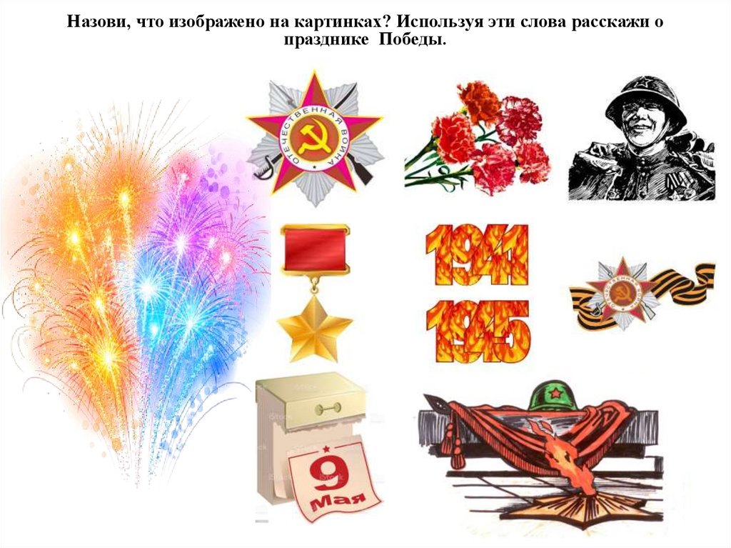 Назови, что изображено на картинках? Используя эти слова расскажи опразднике Победы.