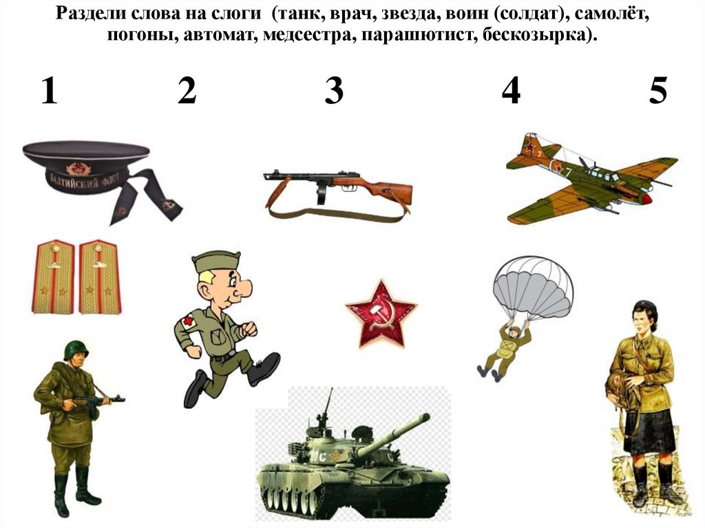 Раздели слова на слоги (танк, врач, звезда, воин (солдат), самолёт,погоны, автомат, медсестра, парашютист, бескозырка).