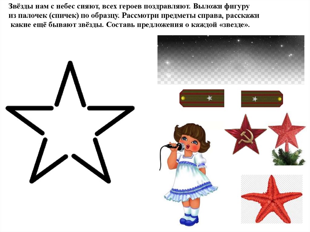 Звёзды нам с небес сияют, всех героев поздравляют. Выложи фигуруиз палочек (спичек) по образцу. Рассмотри предметы справа, расскажи