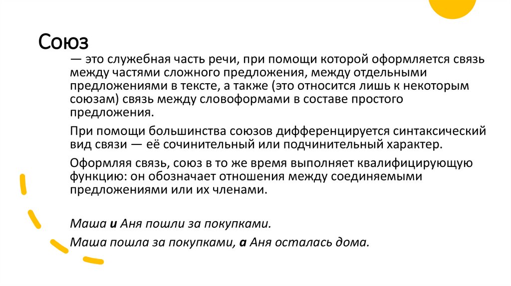 Союз— это служебная часть речи, при помощи которой оформляется связь