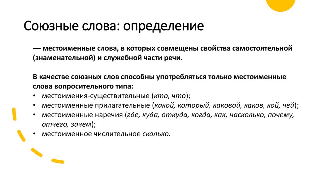 Союзные слова: определение–– местоименные слова, в которых совмещены свойства самостоятельной