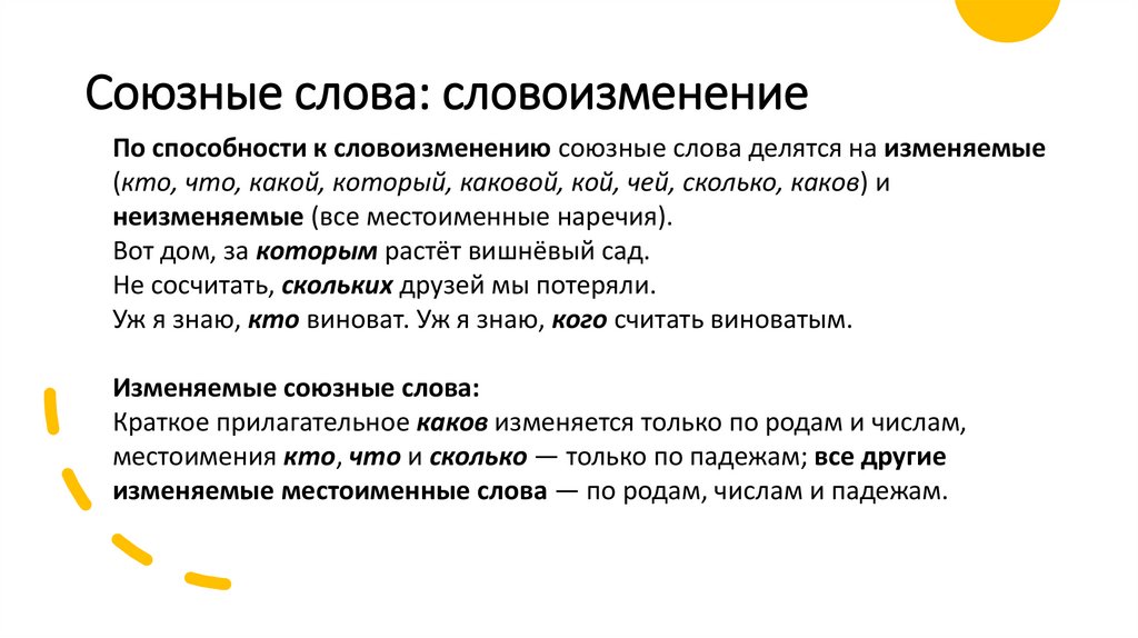 Союзные слова: словоизменениеПо способности к словоизменению союзные слова делятся на изменяемые