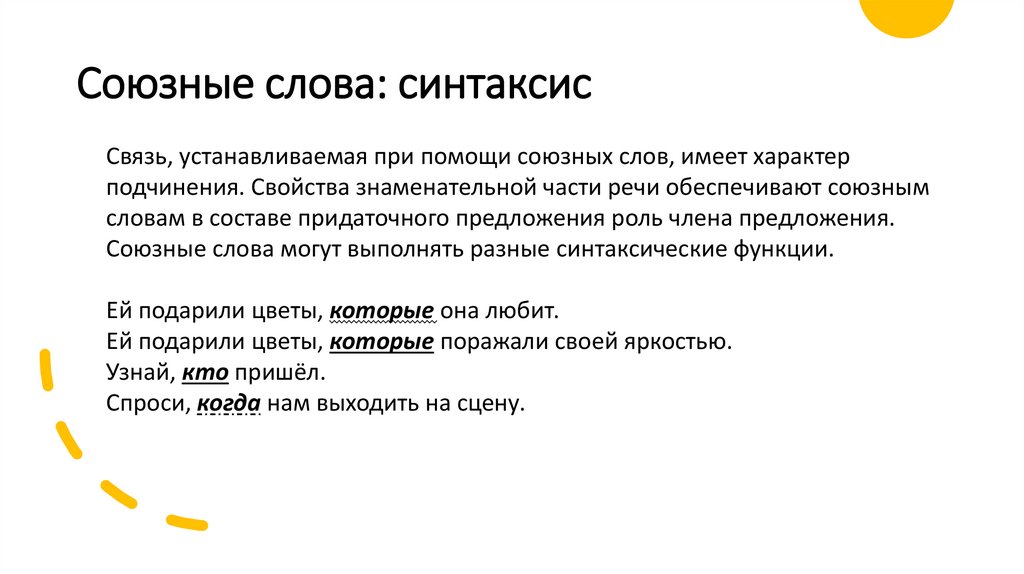 Союзные слова: синтаксисСвязь, устанавливаемая при помощи союзных слов, имеет характер