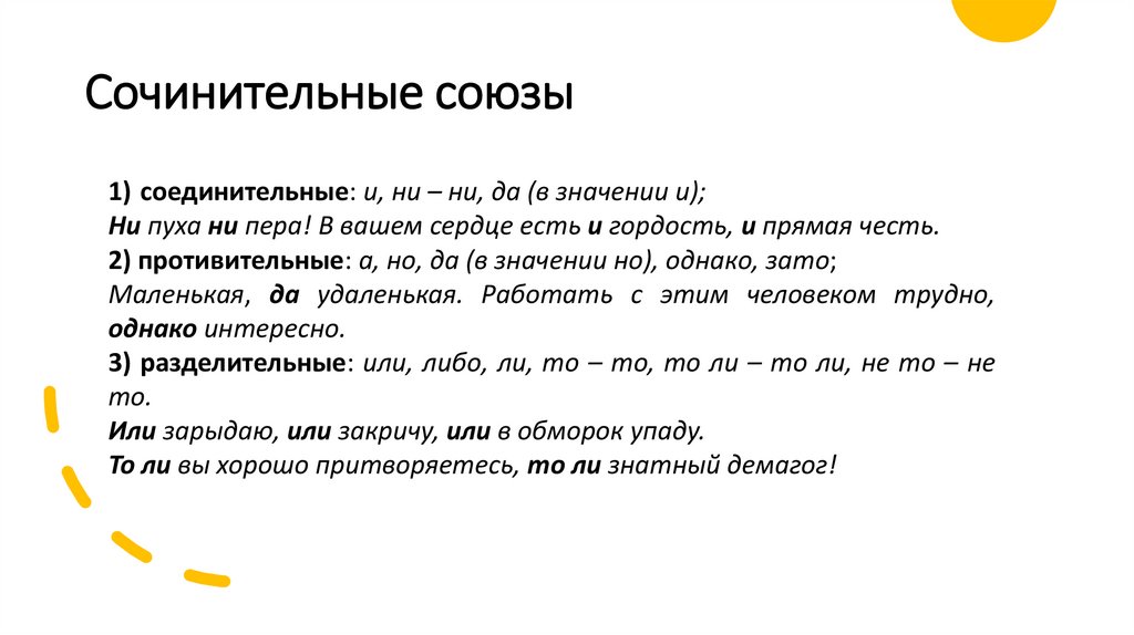Сочинительные союзы1) соединительные: и, ни – ни, да (в значении и);