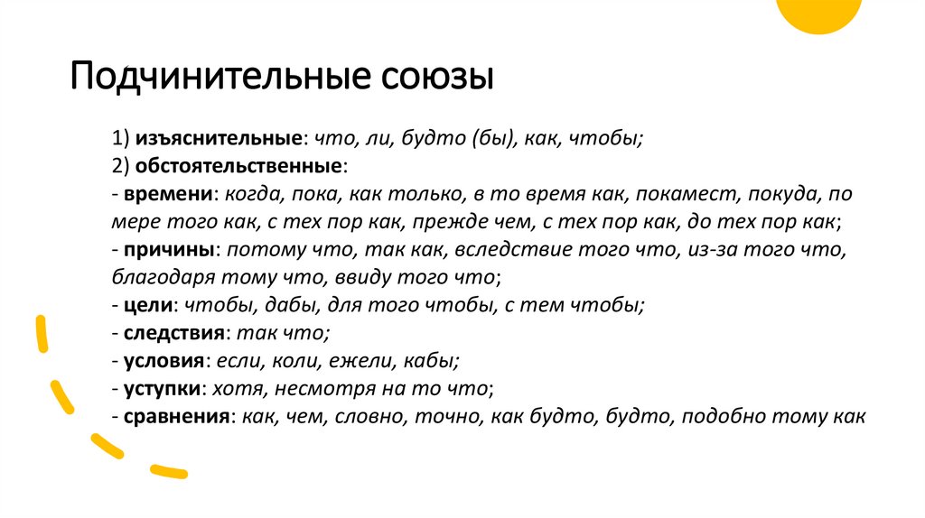 Подчинительные союзы1) изъяснительные: что, ли, будто (бы), как, чтобы;