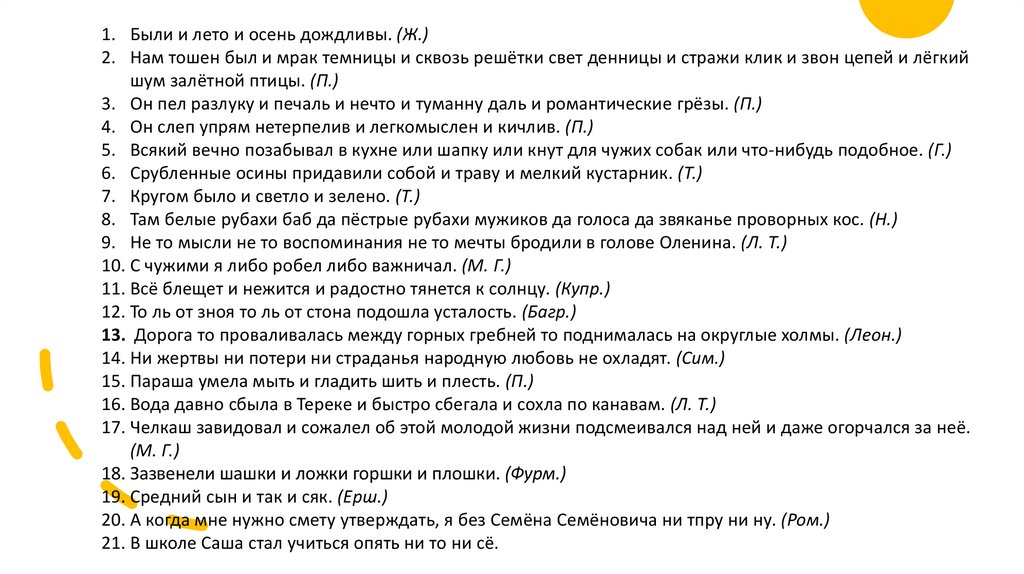 1. Были и лето и осень дождливы. (Ж.)2. Нам тошен был и мрак темницы и сквозь решётки свет денницы и стражи клик и звон цепей и лёгкий
