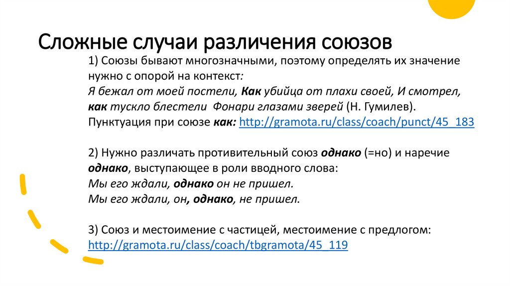 Сложные случаи различения союзов1) Союзы бывают многозначными, поэтому определять их значение