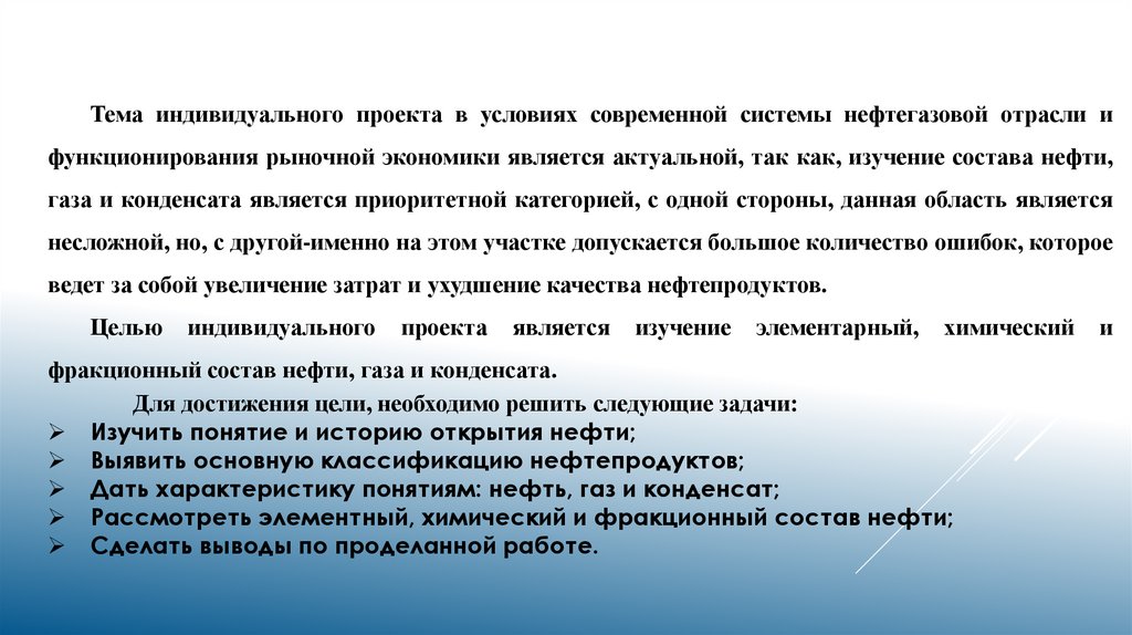 Тема индивидуального проекта в условиях современной системы нефтегазовой отрасли ифункционирования рыночной экономики является актуальной, так как, изучение состава нефти,