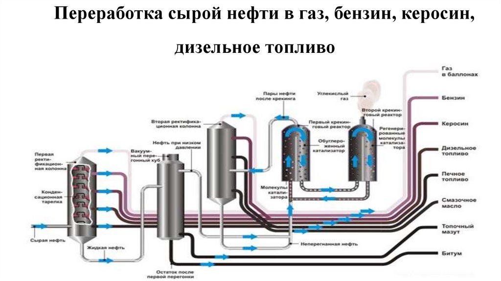 Переработка сырой нефти в газ, бензин, керосин,дизельное топливо