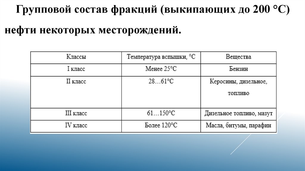 Групповой состав фракций (выкипающих до 200 °С)нефти некоторых месторождений.
