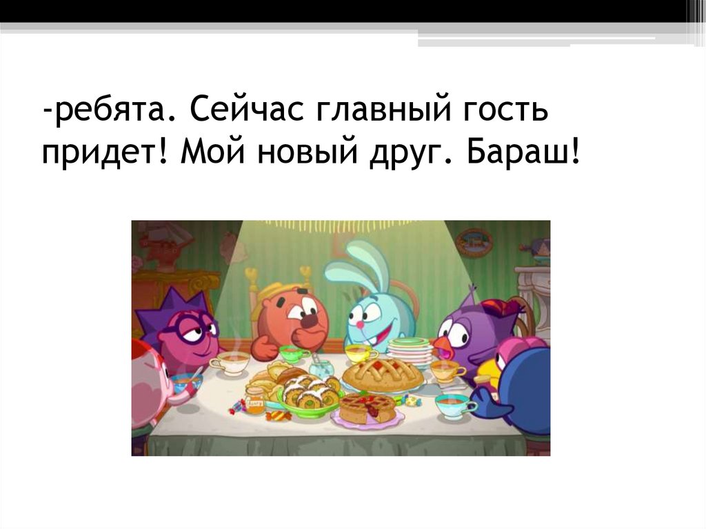 -ребята. Сейчас главный гостьпридет! Мой новый друг. Бараш!