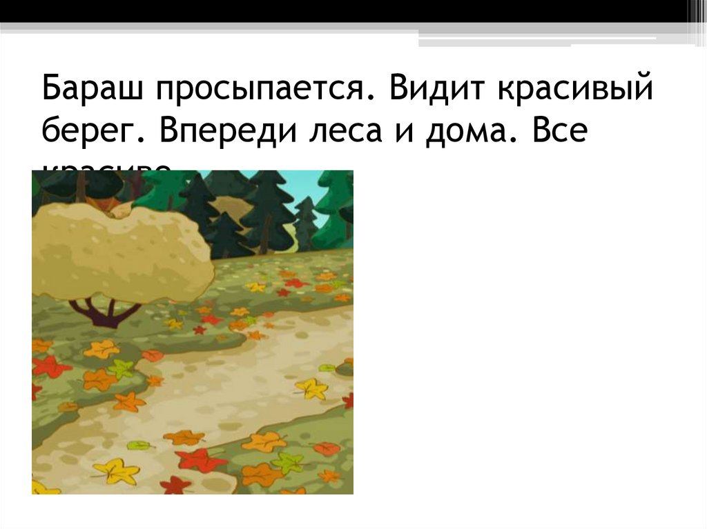 Бараш просыпается. Видит красивыйберег. Впереди леса и дома. Все