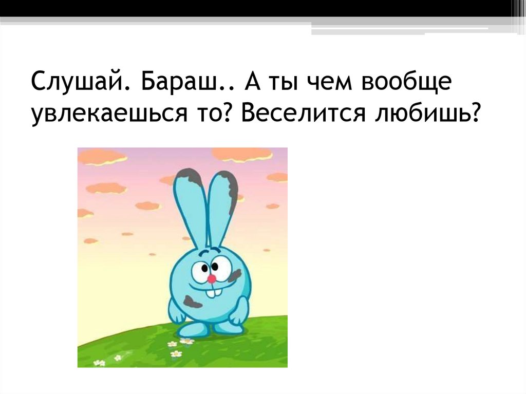 Слушай. Бараш.. А ты чем вообщеувлекаешься то? Веселится любишь?