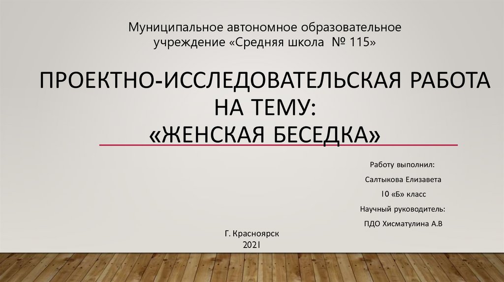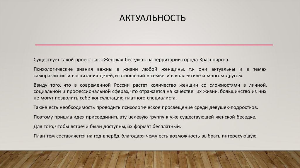 АКТУАЛЬНОСТЬСуществует такой проект как «Женская беседка» на территории города Красноярска.