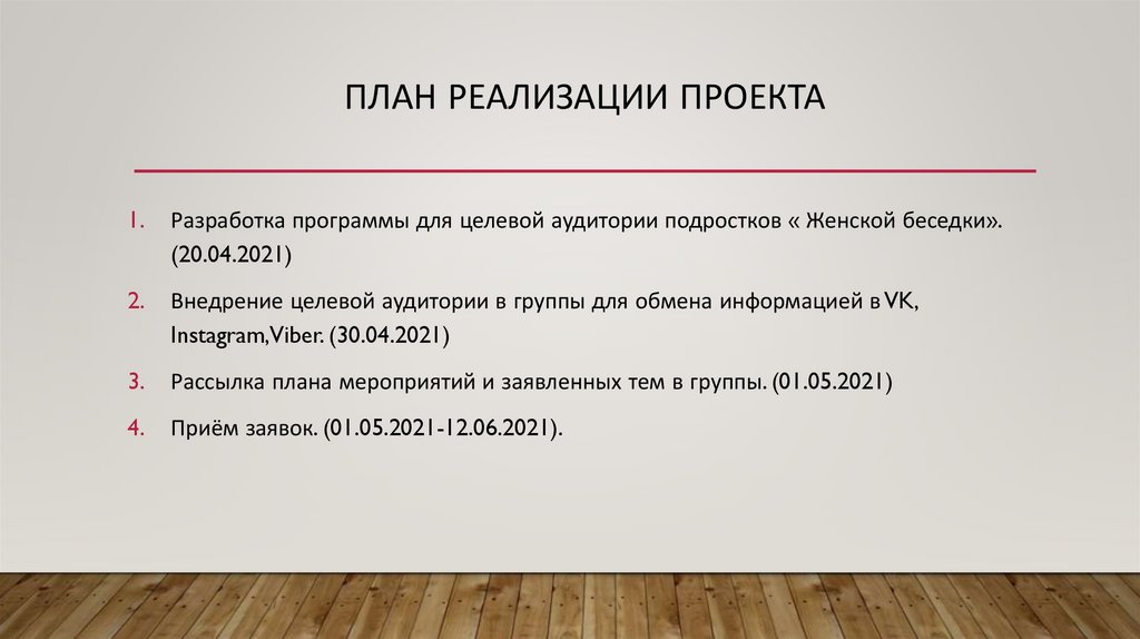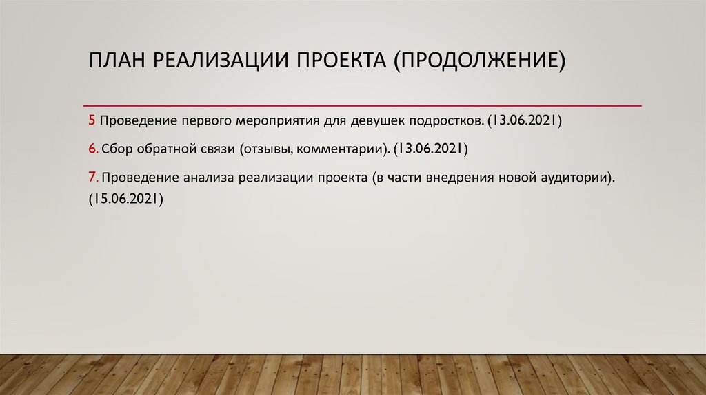 ПЛАН РЕАЛИЗАЦИИ ПРОЕКТА (ПРОДОЛЖЕНИЕ)5 Проведение первого мероприятия для девушек подростков. (13.06.2021)