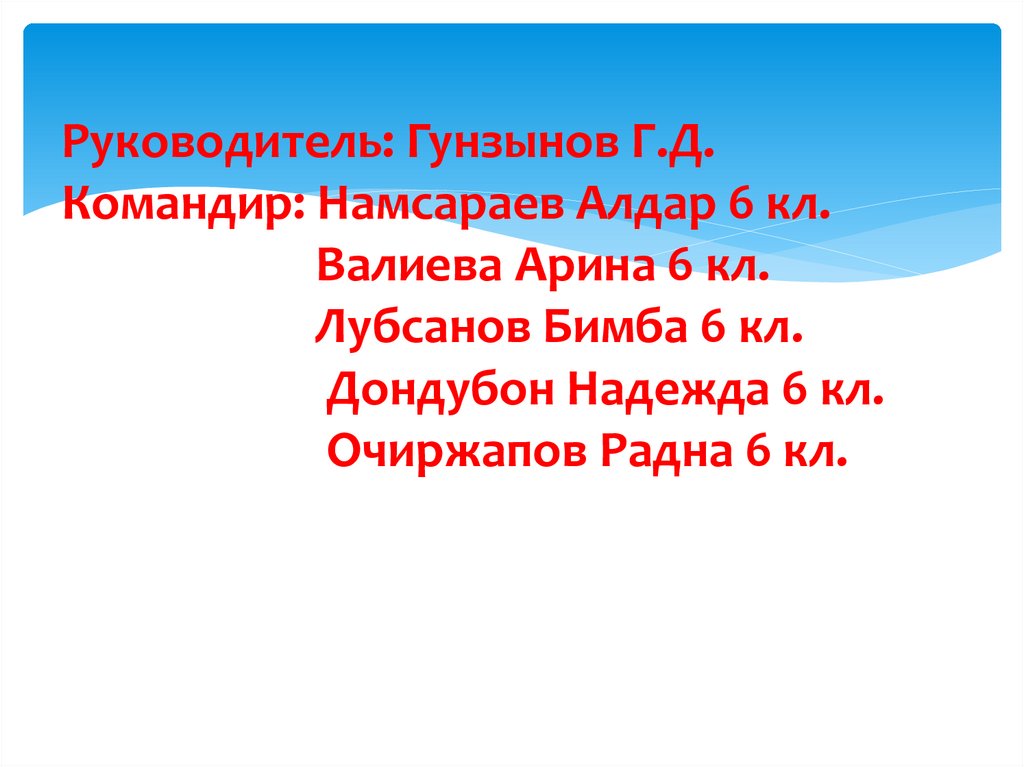 Руководитель: Гунзынов Г.Д.Командир: Намсараев Алдар 6 кл.
