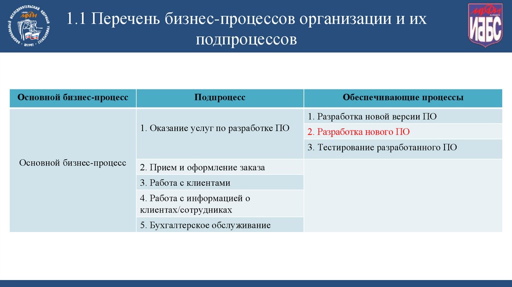1.1 Перечень бизнес-процессов организации и ихподпроцессов