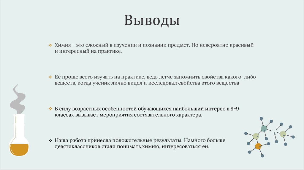 ВыводыХимия - это сложный в изучении и познании предмет. Но невероятно красивый