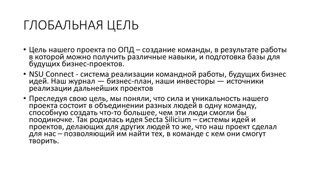 ГЛОБАЛЬНАЯ ЦЕЛЬ• Цель нашего проекта по ОПД – создание команды, в результате работы
