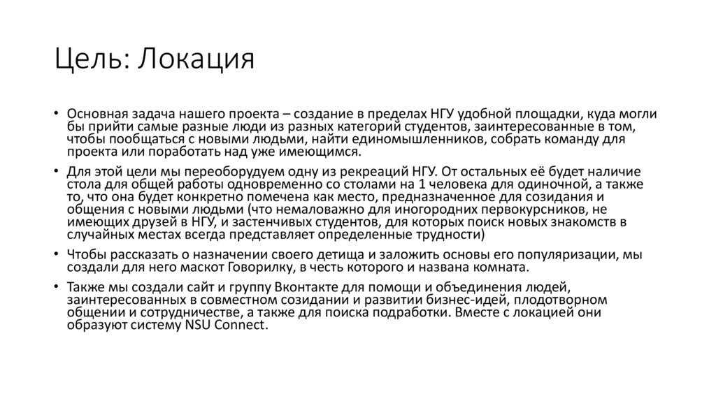 Цель: Локация• Основная задача нашего проекта – создание в пределах НГУ удобной площадки, куда могли