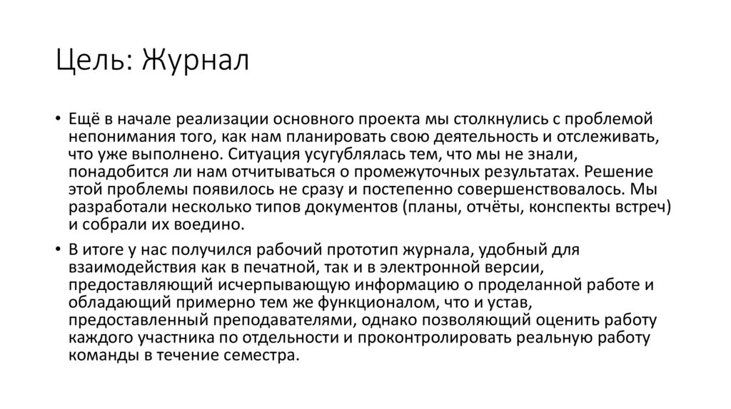 Цель: Журнал• Ещё в начале реализации основного проекта мы столкнулись с проблемой
