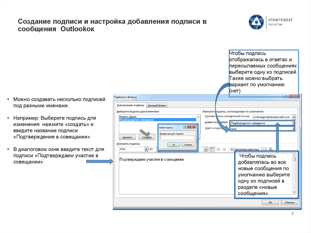 Создание подписи и настройка добавления подписи всообщения Outlookок