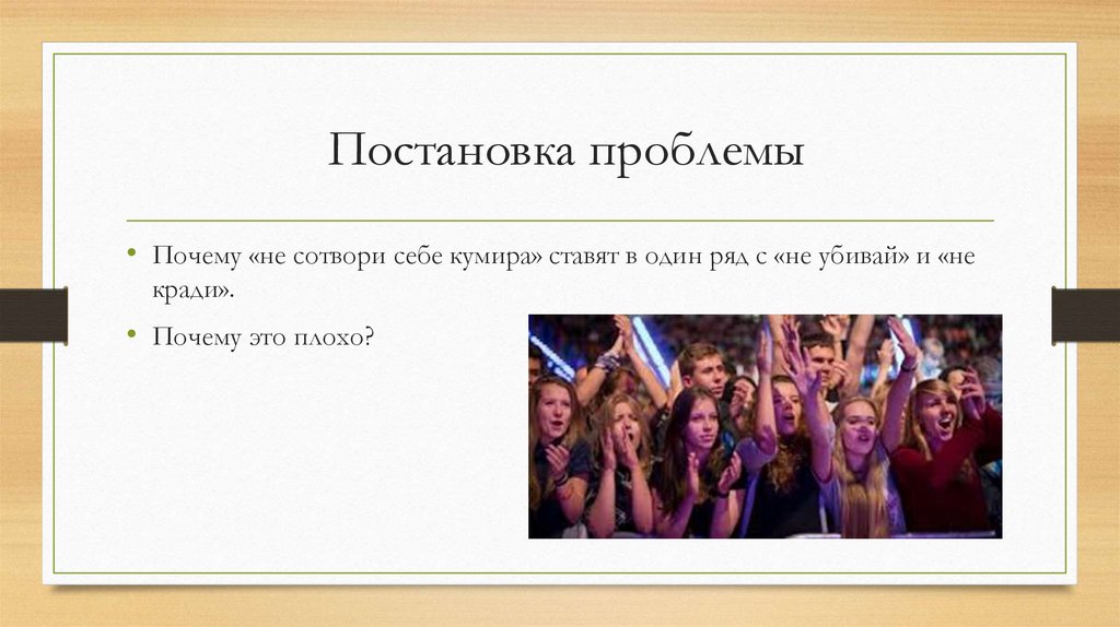 Постановка проблемы• Почему «не сотвори себе кумира» ставят в один ряд с «не убивай» и «не