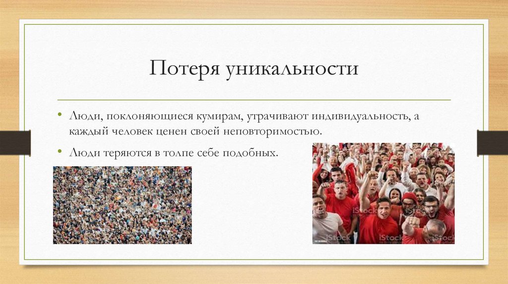 Потеря уникальности• Люди, поклоняющиеся кумирам, утрачивают индивидуальность, а