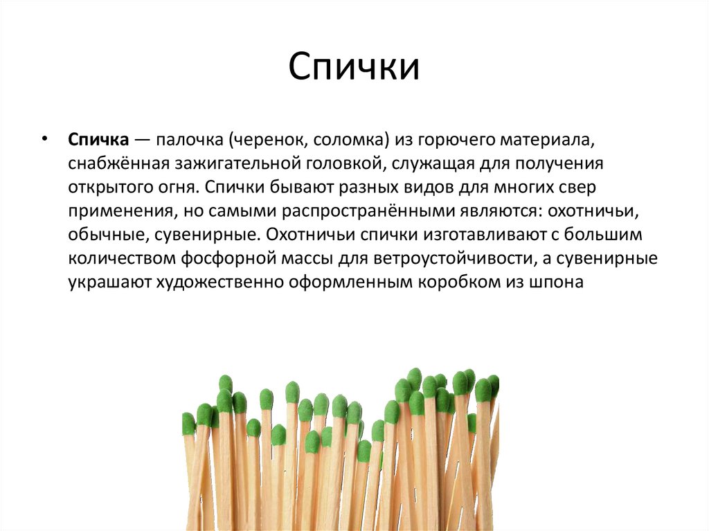 Спички• Спичка — палочка (черенок, соломка) из горючего материала,