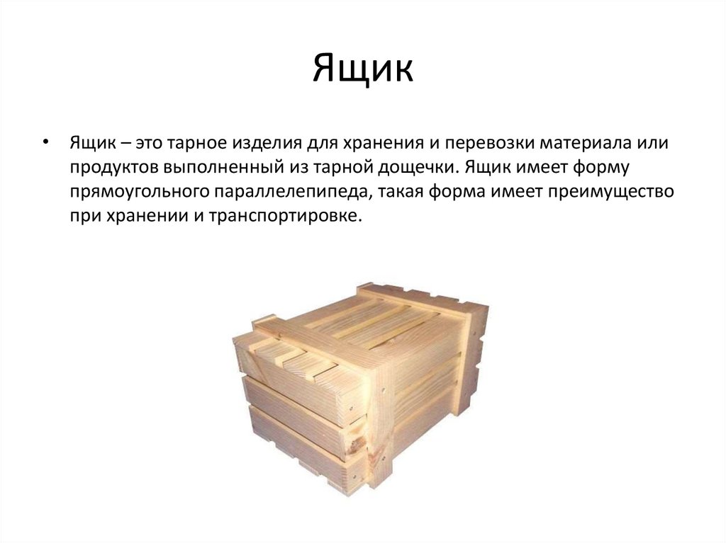 Ящик• Ящик – это тарное изделия для хранения и перевозки материала или