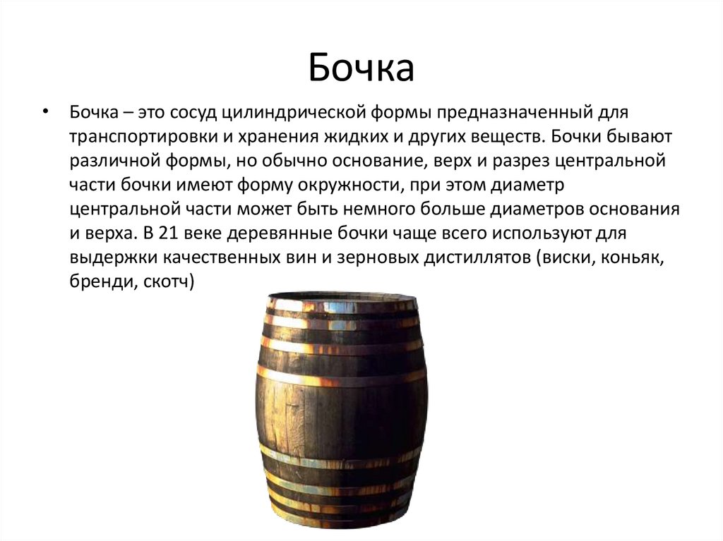 Бочка• Бочка – это сосуд цилиндрической формы предназначенный для