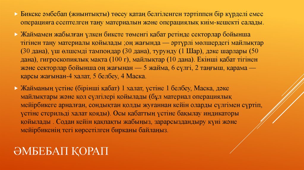 үстіне стерильді халат қояды). Осы қабаттың үстіне бақылау индикаторы