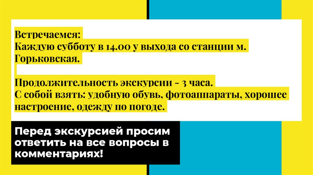 Встречаемся:Каждую субботу в 14.00 у выхода со станции м.