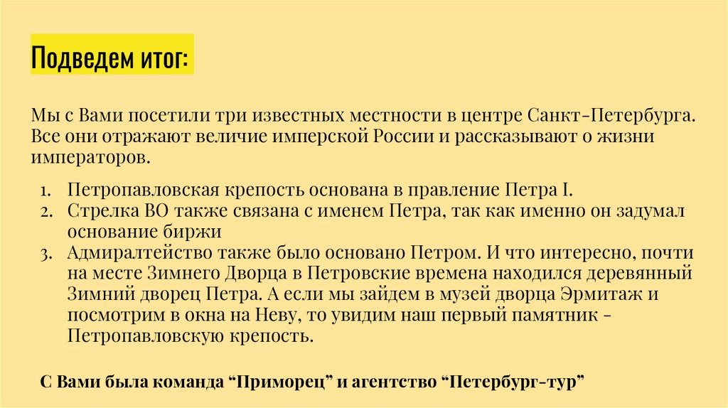 Подведем итог:Мы с Вами посетили три известных местности в центре Санкт-Петербурга.