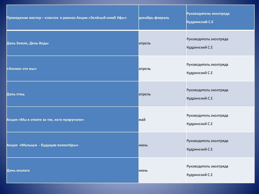 Руководитель экоотрядаПроведение мастер – классов в рамках Акции «Зелёный нимб Уфы»