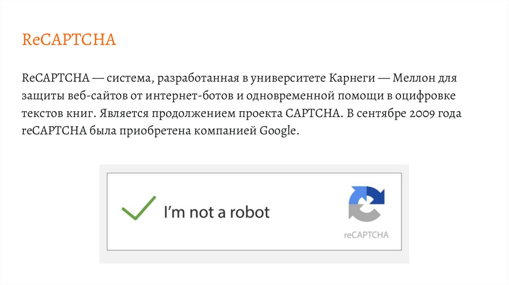 ReCAPTCHAReCAPTCHA — система, разработанная в университете Карнеги — Меллон для