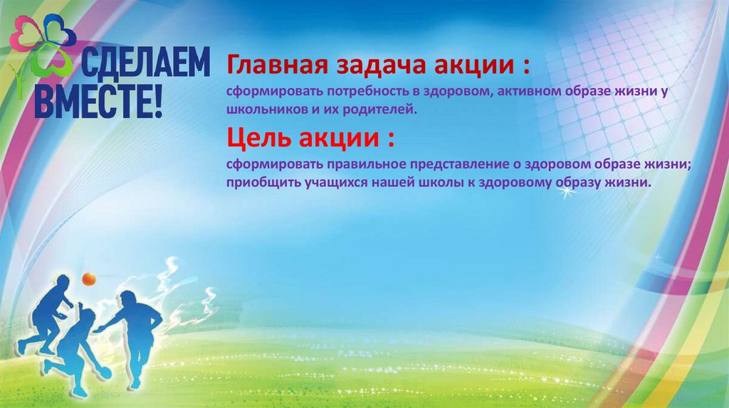 Главная задача акции :сформировать потребность в здоровом, активном образе жизни у