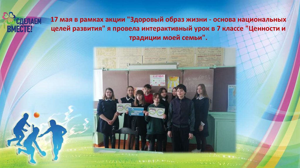 17 мая в рамках акции "Здоровый образ жизни - основа национальныхцелей развития" я провела интерактивный урок в 7 классе "Ценности и