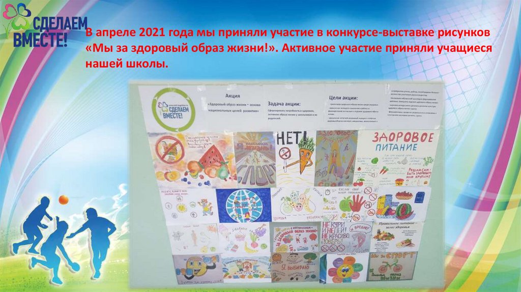 В апреле 2021 года мы приняли участие в конкурсе-выставке рисунков«Мы за здоровый образ жизни!». Активное участие приняли учащиеся