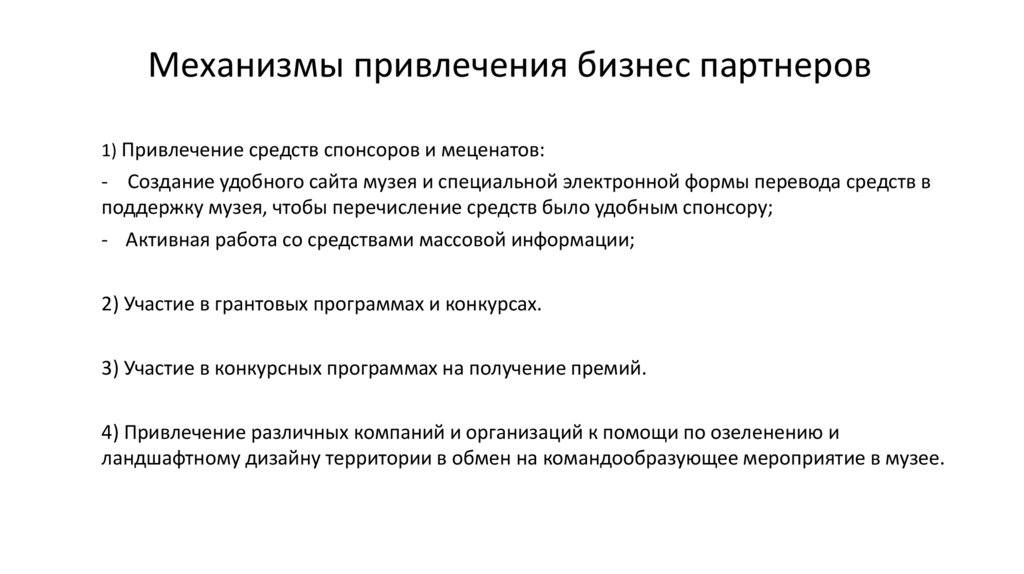 Механизмы привлечения бизнес партнеров1) Привлечение средств спонсоров и меценатов: