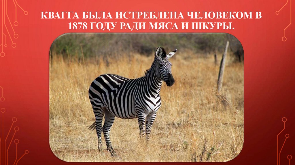 КВАГГА БЫЛА ИСТРЕБЛЕНА ЧЕЛОВЕКОМ В1878 ГОДУ РАДИ МЯСА И ШКУРЫ.